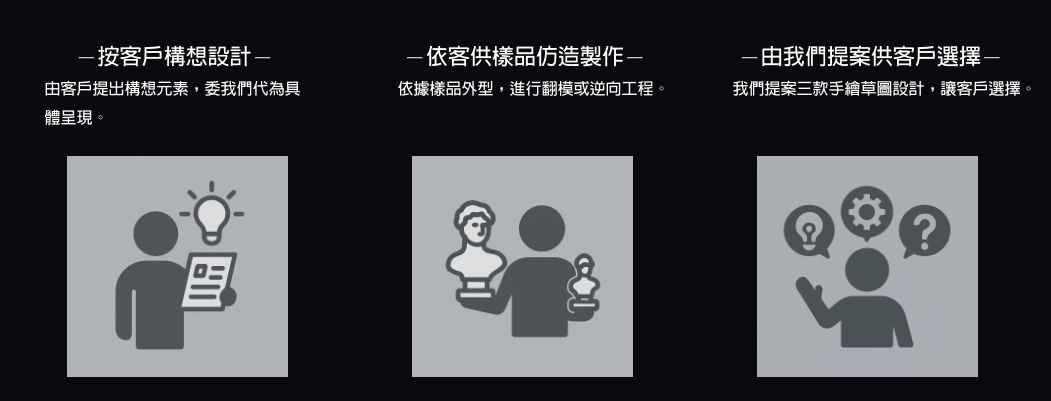 -按客戶構想設計-由客戶提出構想元素,委我們代為具體呈現。-依客供樣品仿造製作-依據樣品外型,進行翻模或逆向工程。-由我們提案供客戶選擇-我們提案三款手繪草圖設計,讓客戶選擇。